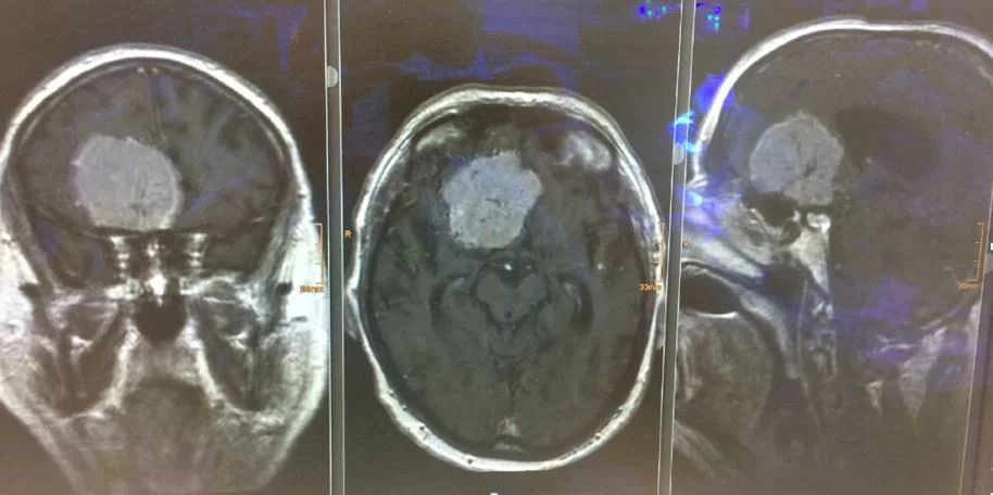 Στην παρακάτω εικόνα παραθέτω την περίπτωση ασθενούς με γιγαντιαίο μηνιγγίωμα το οποίο αφαιρέθηκε μέσα από υπερκόγχιο κρανιοτομία (τομή στο φρύδι). Το αν ο συγκεκριμένος όγκος είναι μεγαλύτερος ή μικρότερος απ’ αυτούς στους οποίους αναφέρεται το viral άρθρο είναι άγνωστο και εν’ τέλει – αδιάφορο.