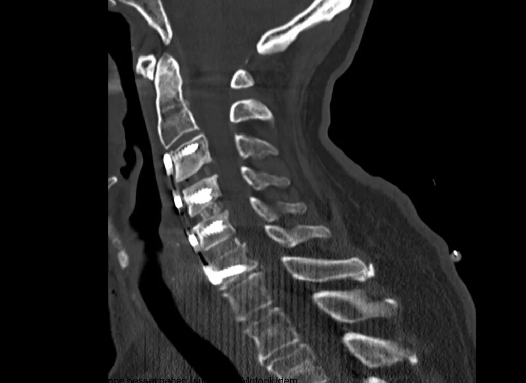 Ο απεικονιστικός έλεγχος έλεγχος με μαγνητική και αξονική τομογραφία της αυχενικής μοίρας της σπονδυλικής στήλης ανέδειξε εκτεταμένη εκφύλιση της σπονδυλικής στήλης με καθίζηση των μεσοσπονδυλίων δίσκων και οστεόφυτα σε πολλαπλά επίπεδα, με επακόλουθη στένωση του σπονδυλικού σωλήνα και των τρημάτων.