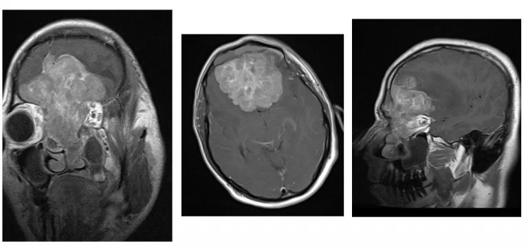 Η αξονική και μαγνητική τομογραφία εγκεφάλου ανέδειξε γιγαντιαία εξεργασία στον πρόσθιο κρανιακό βόθρο με σημαντική επέκταση εντός της ρινικής κοιλότητας και διήθηση των οφθαλμικών κόγχων, κυρίως αριστερά.
