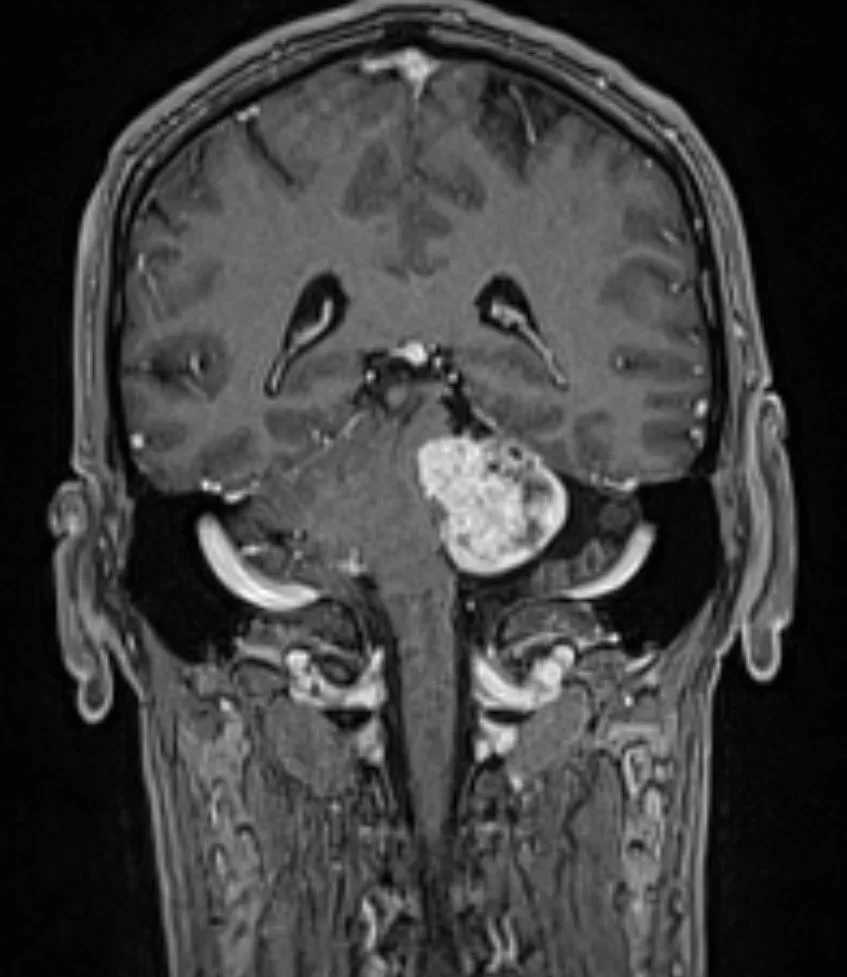 Η μαγνητική τομογραφία εγκεφάλου ανέδειξε χωροκατακτητική εξεργασία στην αριστερή γεφυροπαρεγκεφαλιδική γωνία συμβατή με ακουστικό νευρίνωμα (αιθουσαίο σβάννωμα) και πίεση επί του στελέχους (Koos IV).