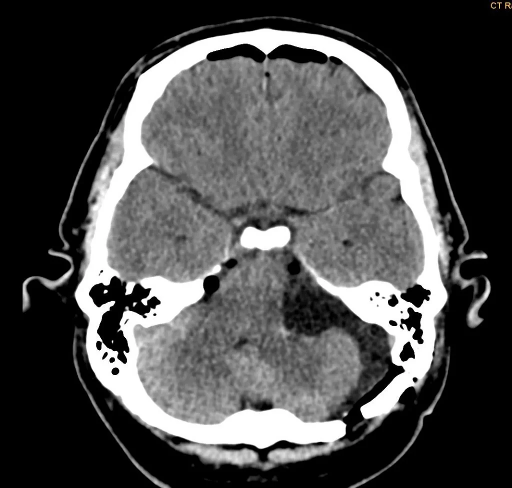 Η μαγνητική τομογραφία εγκεφάλου ανέδειξε χωροκατακτητική εξεργασία στην αριστερή γεφυροπαρεγκεφαλιδική γωνία συμβατή με ακουστικό νευρίνωμα (αιθουσαίο σβάννωμα) και πίεση επί του στελέχους (Koos IV).