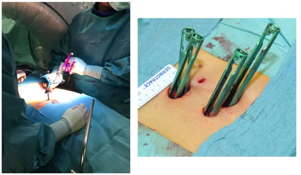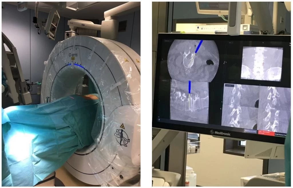 Οι σύγχρονες τεχνικές και η τεχνολογία επιτρέπουν πλέον η σπονδυλοδεσία να πραγματοποιείται με πολύ μικρές τομές και ελάχιστο τραύμα (και κατ’ επέκταση πόνο) για τον ασθενή. Η πιο σύγχρονη μέθοδος είναι η διαδερμική σπονδυλοδεσία με νευροπλοηγό (Εικόνες 4 – 6). Στην τεχνική αυτή, οι βίδες και οι ράβδοι τοποθετούνται μέσα από πολύ μικρές τομές και με τη βοήθεια της 3D-νευροπλοήγησης τα μοσχεύματα μπορούν να τοποθετηθούν με εξαιρετική ακρίβεια.