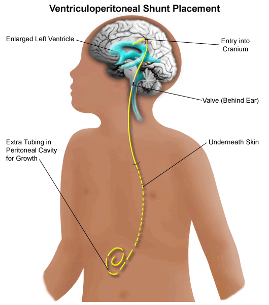 Ο υδροκέφαλος αντιμετωπίζεται συνήθως με την εισαγωγή μιας κοιλιοπεριτοναϊκής παροχέτευσης ή αλλιώς «βαλβίδας». Πρόκειται για την τοποθέτηση ενός πολύ λεπτού και μαλακού καθετήρα απο σιλικόνη, με την παρεμβολή μιας μικρής βαλβίδας , από τον εγκέφαλο στην περιτοναϊκή κοιλότητα, δηλαδή στην κοιλιά. Αυτό το σύστημα εκτρέπει την ροή του ΕΝΥ από τον εγκέφαλο σε άλλη περιοχή του σώματος όπου μπορεί να απορροφηθεί ως μέρος της κανονικής κυκλοφοριακής διαδικασίας. Η βαλβίδα τοποθετείται κατά μήκος του καθετήρα και έχει σαν στόχο να διατηρεί μονόδρομη ροή και να ρυθμίζει την ταχύτητα της ροής του ΕΝΥ.