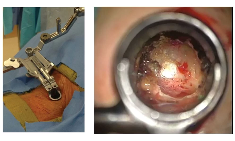 Η επέμβαση γίνεται υπό γενική αναισθησία και συχνά υπό νευροπαρακολούθηση. Ο νευροχειρουργός πραγματοποιεί μια μικρή τομή στην οπίσθια επιφάνεια του αυχένα. Στη συνέχεια τοποθετείται ένας διαστολέας. Ιδανικά η επέμβαση γίνεται με ελάχιστα επεμβατικές μεθόδους (Εικόνα 2). Αφού αφαιρεθεί ένα μικρό κομμάτι οστού το οποίο καλύπτει την ρίζα (νεύρο) ο νευροχειρουργός αφαιρεί το σπασμένο κομμάτι του δίσκου και απελευθερώνει τη ρίζα. Στη συνέχεια ο διαστολέας αφαιρείται και το τραύμα κλείνεται κατά στρώματα.