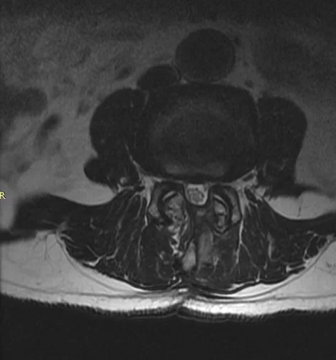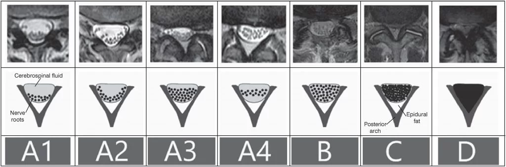 Η διάγνωση συνήθως μπαίνει με την αξονική τομογραφία και τη μαγνητική τομογραφία. Η αξονική τομογραφία δείχνει πολύ καλά την ποιότητα των οστών ενώ η μαγνητική τομογραφία δείχνει εξαιρετικά ποιά νευρικά στοιχεία πιέζονται και βοηθά στην σωστή εκτίμηση της στένωσης (Εικόνα 3). Η μαγνητική τομογραφία είναι η πιό σημαντική εξέταση σ’ αυτή την περίπτωση.