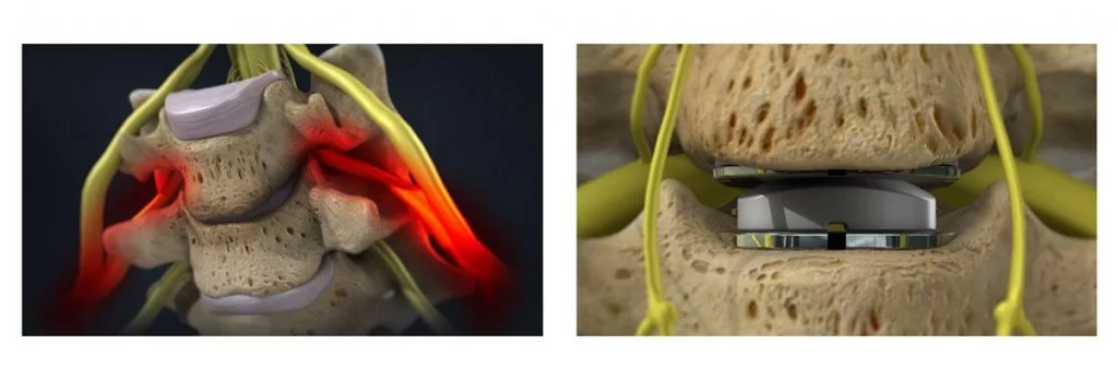 Εικόνα 1. Αριστερά: Σχηματική απεικόνιση εκφυλισμένου δίσκου με πίεση και ερεθισμό των αυχενικών ριζών. Δεξιά: Ο εκφυλισμένος δίσκος αντικαταστάθηκε με τεχνητό.