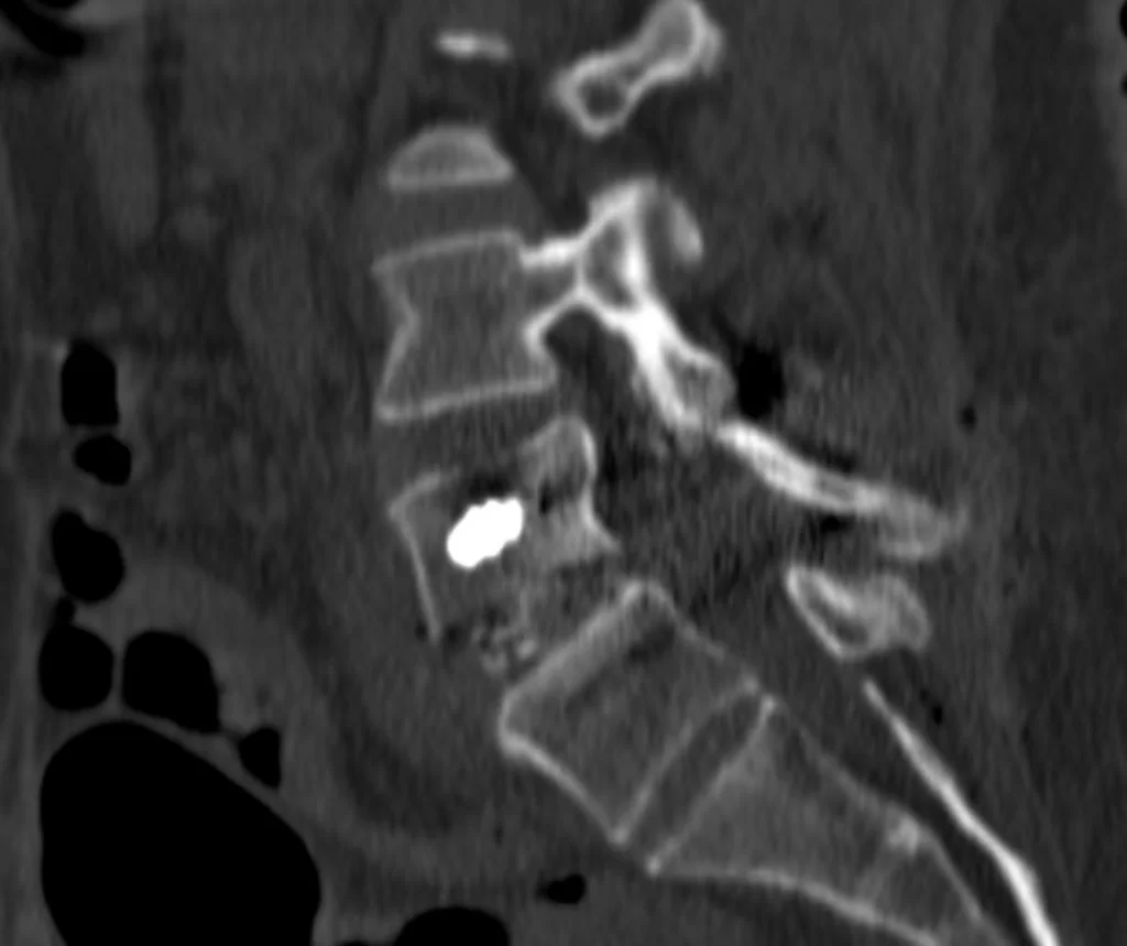 Ο απεικονιστικός έλεγχος ανέδειξε σπονδυλολίσθηση 2ου βαθμού σε έδαφος σπονδυλόλυσης (λύση της συνέχειας του οστού στον ισθμό, δηλαδή μεταξύ των δύο αρθρώσεων).
