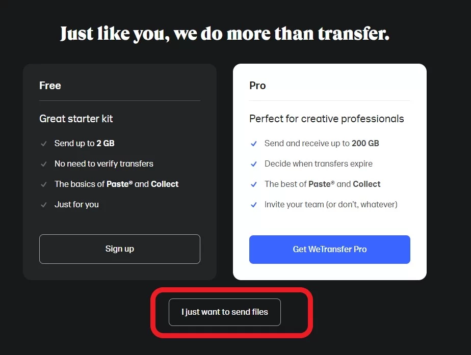 Κλικάρετε στο “i just want to sent files“. Αυτό σημαίνει ότι απλώς θέλετε να στείλετε κάποια αρχεία χωρίς να κάνετε νωρίτερα εγγραφή.