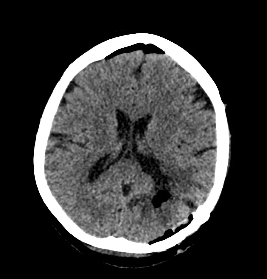 Η μετεγχειρητική αξονική τομογραφία εγκεφάλου δείχνει πλήρη αφαίρεση της βλάβης. Η ιστολογική εξέταση ανέδειξε μηνιγγίωμα WHO I.