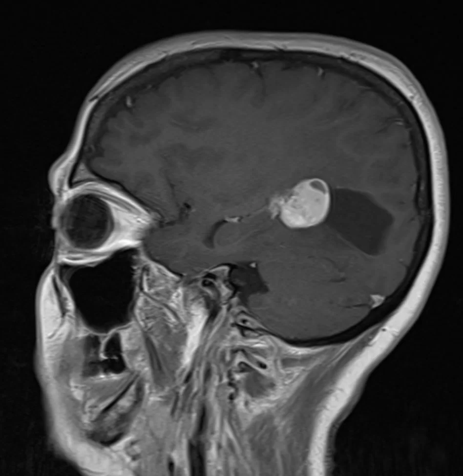 Η μαγνητική τομογραφία ανέδειξε χωροκατακτητική εξεργασία εντός της αριστερής πλάγιας κοιλίας του εγκεφάλου.