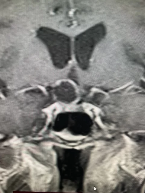 Η μαγνητική τομογραφία εγκεφάλου αναδεικνύει χωροκατακτητική εξεργασία (όγκο) στην περιοχή του εφιππίου, με σημαντική πίεση επί του οπτικού χιάσματος.