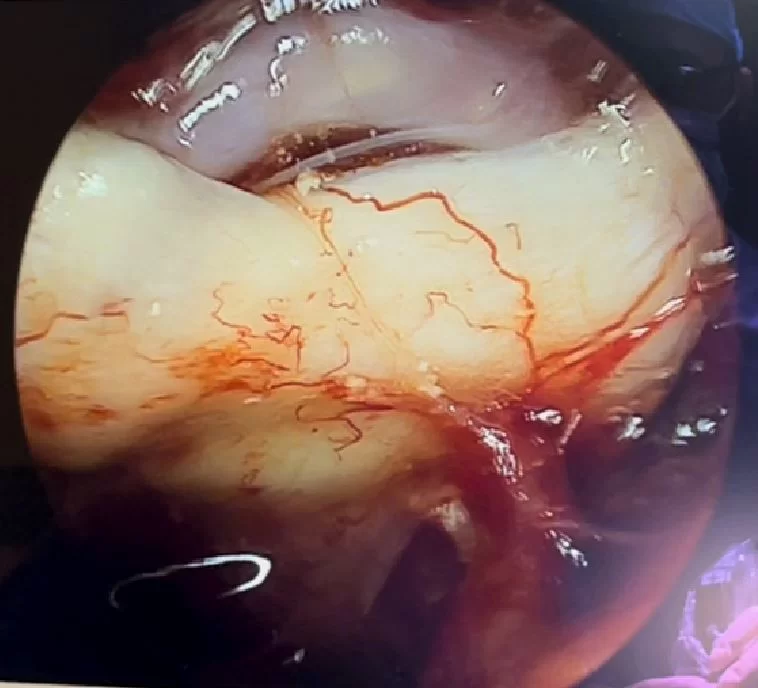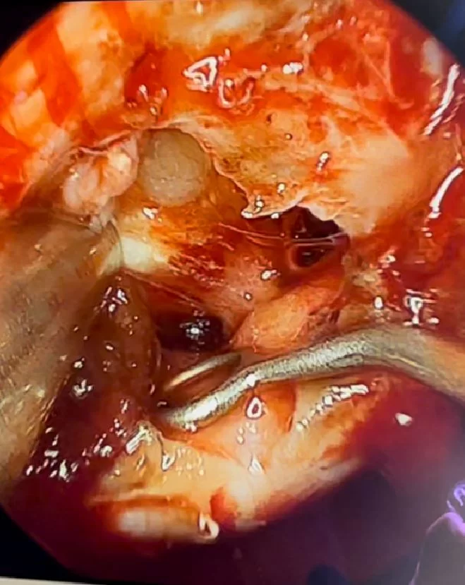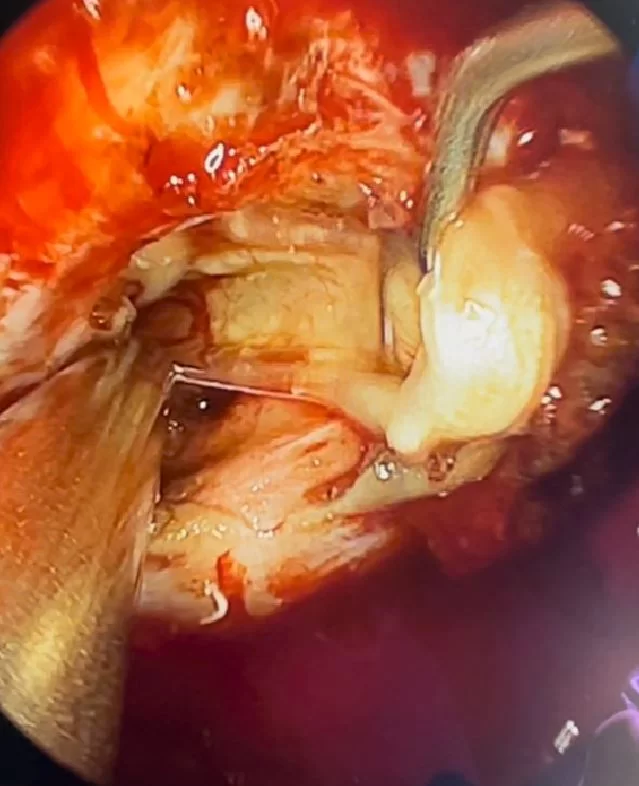 Στη συγκεκριμένη ασθενή επιλέξαμε να αφαιρέσουμε τη βλάβη με τη βοήθεια του ενδοσκοπίου, μέσα από τη μύτη. Η ενδοσκοπική αφαίρεση επιτρέπει να ελεγχθεί πλήρως ολόκληρη η περιοχή του εφιππίου και να επιτευχθεί τελικά ολική αφαίρεση του όγκου χωρίς τομή στο κρανίο!