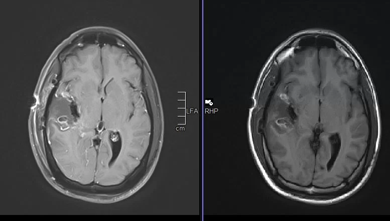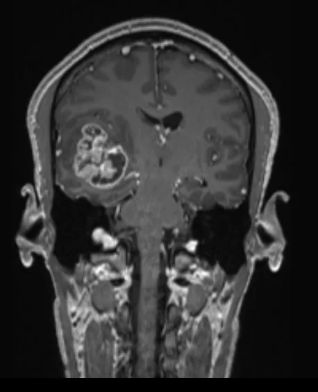 H Μαγνητική Τομογραφία εγκεφάλου ανέδειξε εκτεταμένη χωροκατακτητική εξεργασία δεξιά κροταφικά με πίεση επί του σύστοιχου κροταφικού κέρατος και σημαντικό περιεστιακό οίδημα.