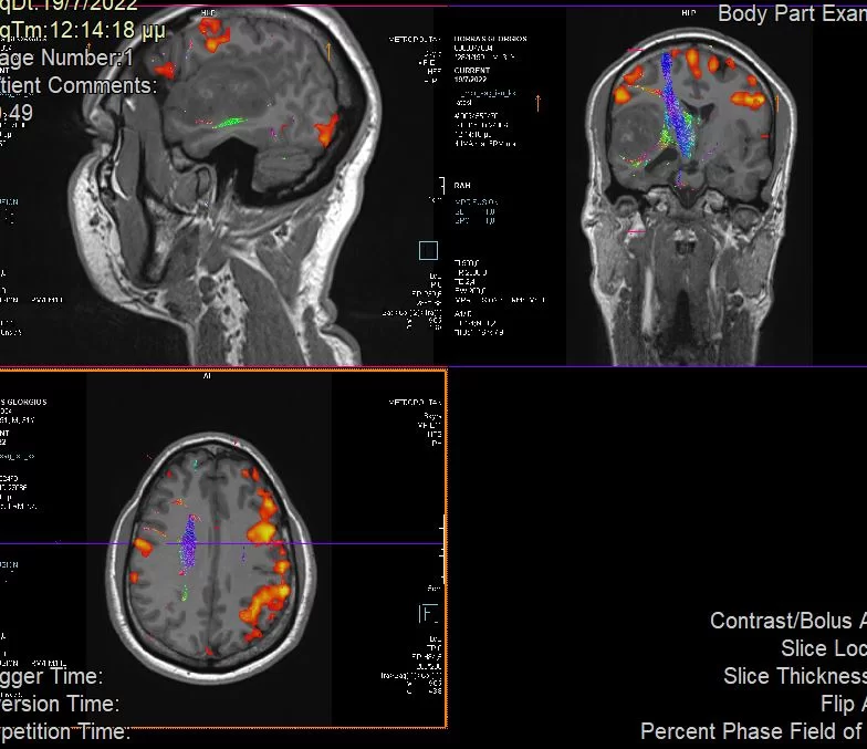 Προεγχειρητικά ο όγκος και η σχέση του με τις σημαντικές ανατομικές δομές και λειτουργίες μελετήθηκε με τη βοήθεια της λειτουργικής μαγνητικής και της μαγνητικής δεσμιδογραφίας. Με απλά λόγια, αυτές οι εξετάσεις μας έδειξαν πόσο μακριά είναι ο όγκος από όλα εκείνα τα στοιχεία που θέλουμε να προφυλάξουμε.