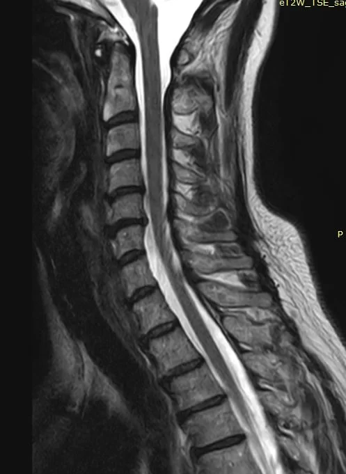 Ο απεικονιστικός έλεγχος με μαγνητική και αξονική τομογραφία της σπονδυλικής στήλης ανέδειξε εικόνα δισκοκήλης στα επίπεδα Α5/6 και λιγότερο Α4/5. Το σημαντικότερο εύρημα ήταν η πλάγια τρηματική στένωση με πίεση επί των ριζών Α6 & Α5 αριστερά.