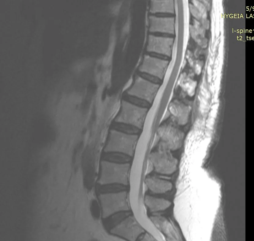 Ο έλεγχος με μαγνητική τομογραφία με σκιαγραφικό ανέδειξε μηνιγγίωμα όπισθεν του Θ12 σπονδύλου, με σημαντική πίεση επί των νευρικών στοιχείων.