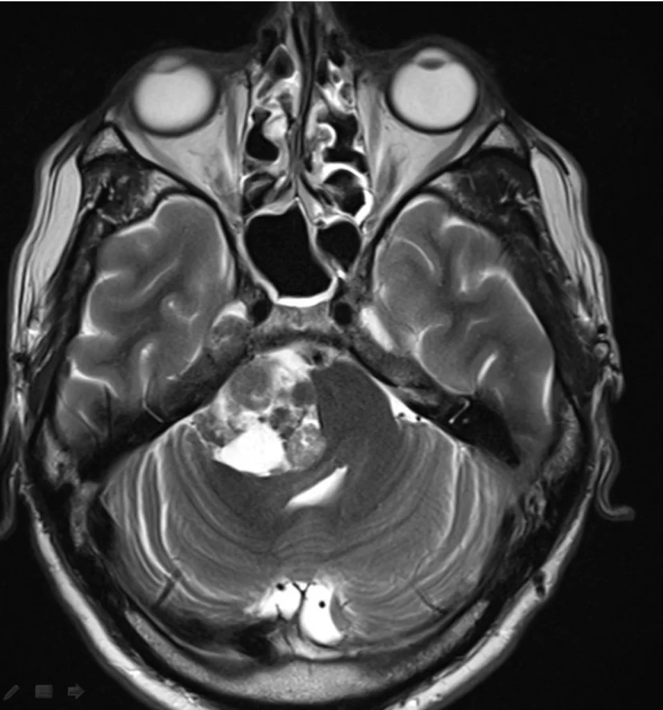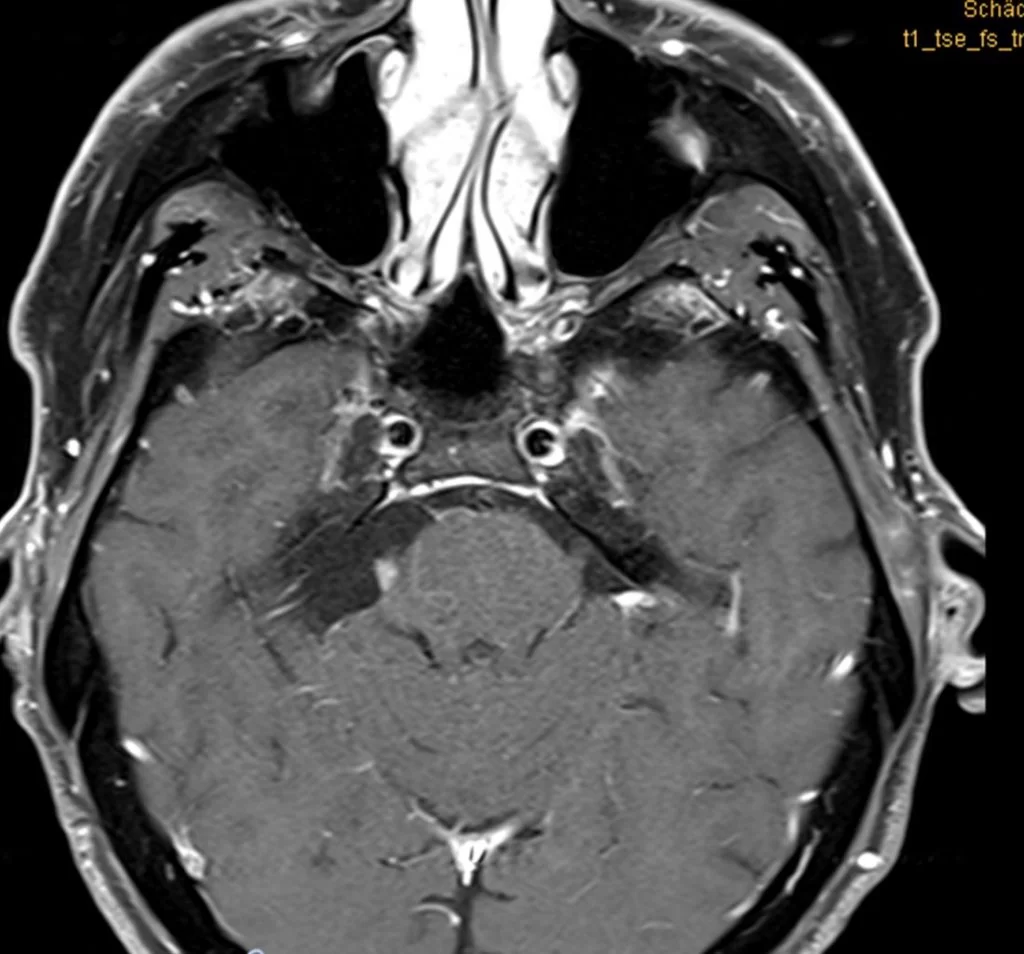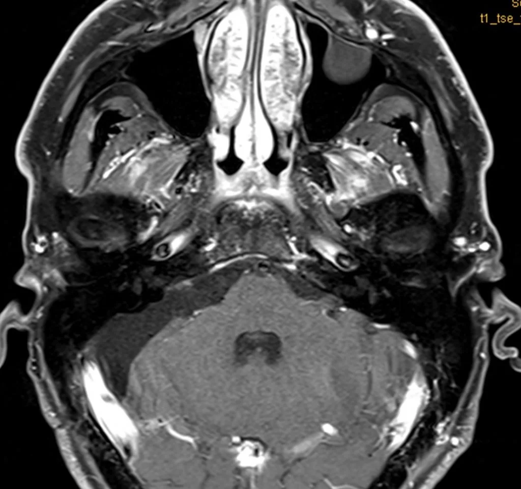 Η μαγνητική τομογραφία εγκεφάλου ανέδειξε εκτεταμένη χωροκατακτητική εξεργασία στην γεφυροπαρεγκεφαλιδική γωνία δεξιά, με επέκταση στην περιοχή του γασσέρειου γαγγλίου του τριδύμου .