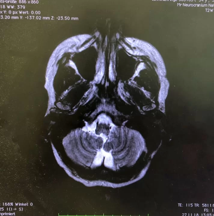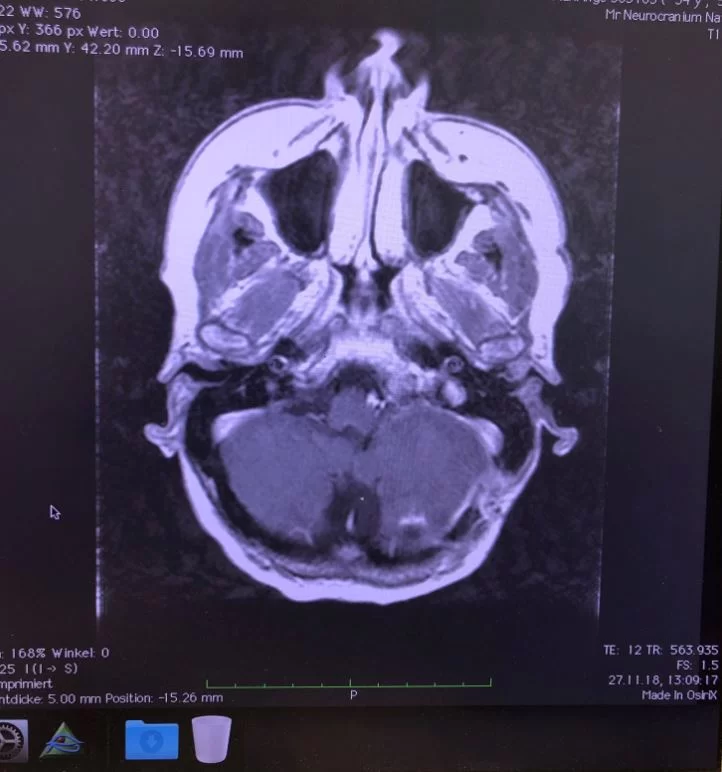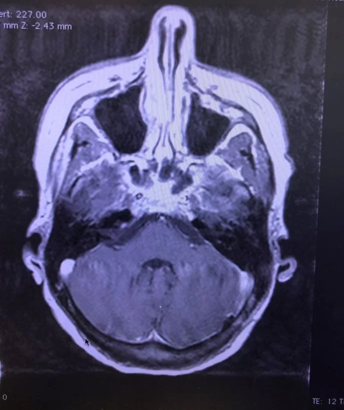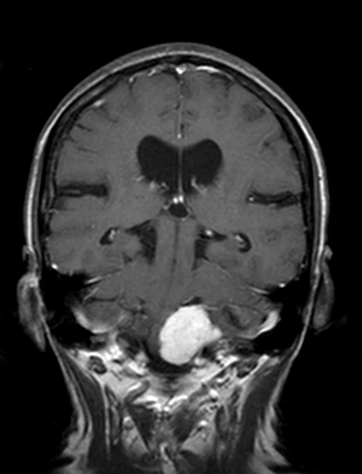 Ο προεγχειρητικός έλεγχος ανέδειξε μηνιγγίωμα της κρανιοαυχενικής συμβολής με εγκολεασμό σημαντικών αγγειακών και νευρικών δομών και επέκταση προς την αντίθετη πλευρά.