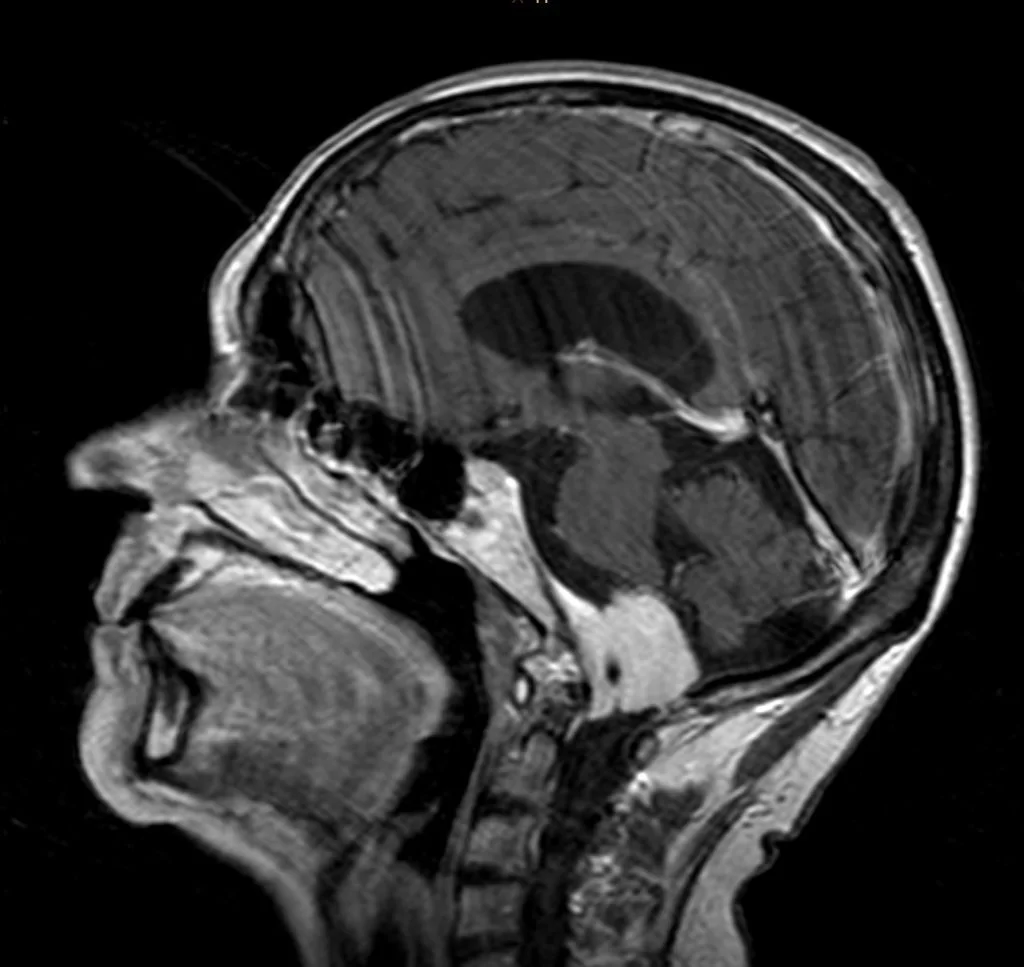 Η μετεγχειρητική μαγνητική τομογραφία εγκεφάλου δείχνει ένα εξαιρετικό αποτέλεσμα, με πλήρη αφαίρεση της βλάβης. Η ιστολογική εξέταση επιβεβαίωσε τη διάγνωση (μηνιγγίωμα WHO I).
