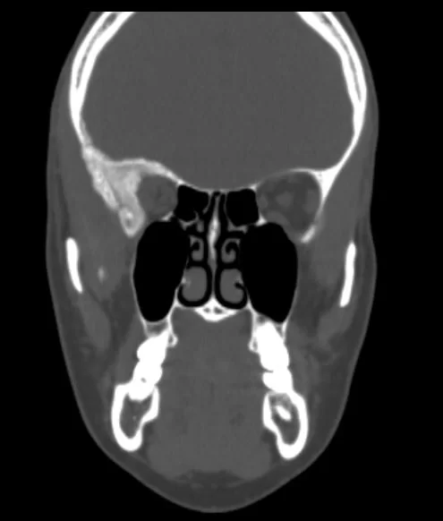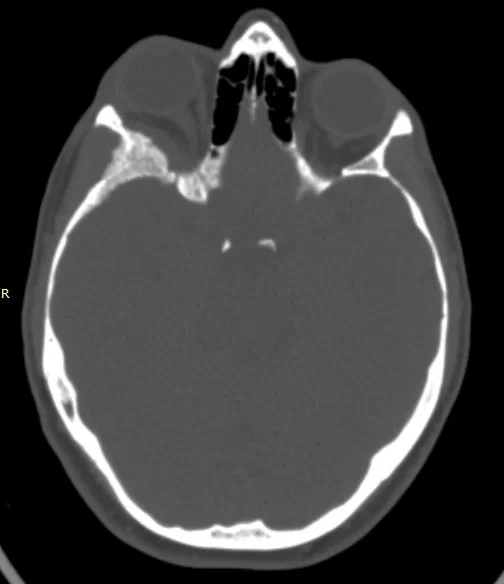H Μαγνητική  & Αξονική Τομογραφία εγκεφάλου ανέδειξε χωροκατακτητική εξεργασία στην περιοχή της πτέρυγας του σφηνοειδούς οστού, δηλ. του άνω (οροφή) και του πλαγίου τοιχώματος του οφθαλμικού κόγχου. Η εξεργασία επεκτείνονταν κατά μήκος της σκληράς μήνιγγας ενώ στην περιοχή του κροταφικού πόλου παρουσίασε ενδοκρανιακή επέκταση. Η πάχυνση του οστού του κόγχου προκαλούσε πίεση των περιεχομένων του κόγχου με αποτέλεσμα εξόφθαλμο.