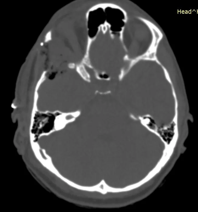 Η μετεγχειρητική αξονική τομογραφία εγκεφάλου ανέδειξε τη γενναιόδωρη αποσυμπίεση του κόγχου.