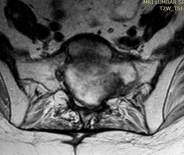 Ασθενής 55 ετών με γνωστή εκτεταμένη εξεργασία (όγκος) του ιερού οστού. Είχε προηγηθεί προσπάθεια αφαίρεσης της βλάβης. Κλινικά η ασθενής παρουσίαζε προοδευτική επιδείνωση της κλινικής της εικόνας με ισχιαλγία, οσφυαλγία και διαταραχές στον έλεγχο της κύστης και του εντέρου. Από τον απεικονιστικό έλεγχο διαπιστώθηκε ευμεγέθης εξεργασία ιερού με σημαντική πίεση στα νεύρα της ιππουρίδας καθώς επίσης και σημαντική οστεόλυση του Ο5 σπονδύλου και του ιερού οστού.