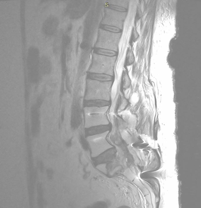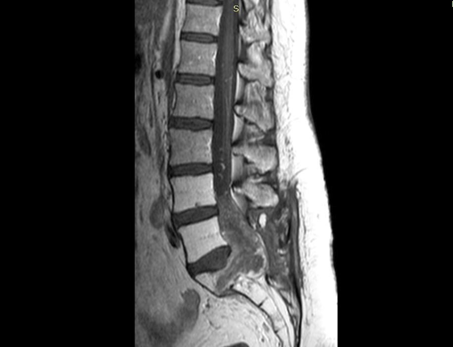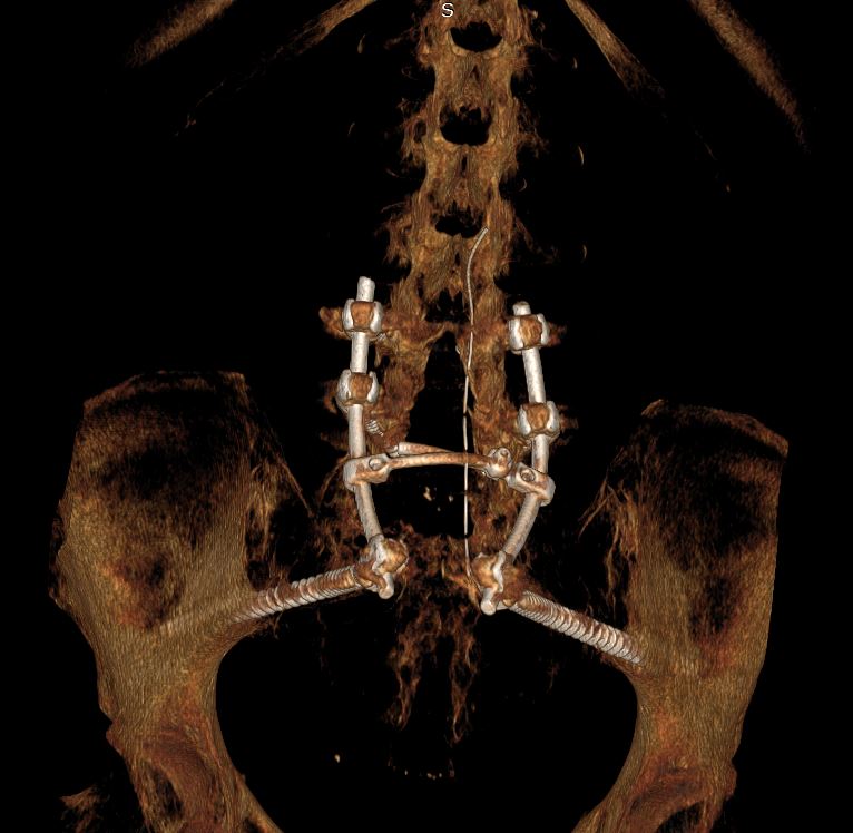 Πρώτον, υπάρχει σημαντικό πρόβλημα στήριξης της οσφυϊκής μοίρας και επαπειλούμενο κάταγμα ιερού. Λόγω της διήθησης του οστού από τον όγκο, έχει δημιουργηθεί σημαντικό οστικό έλλειμα στον τελευταίο οσφυϊκό σπόνδυλο και στο ιερό οστό.
