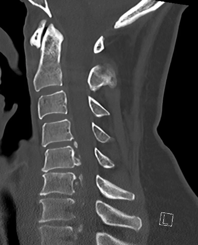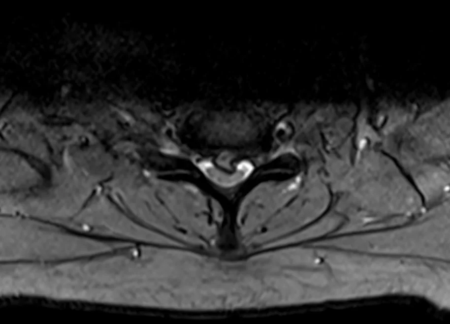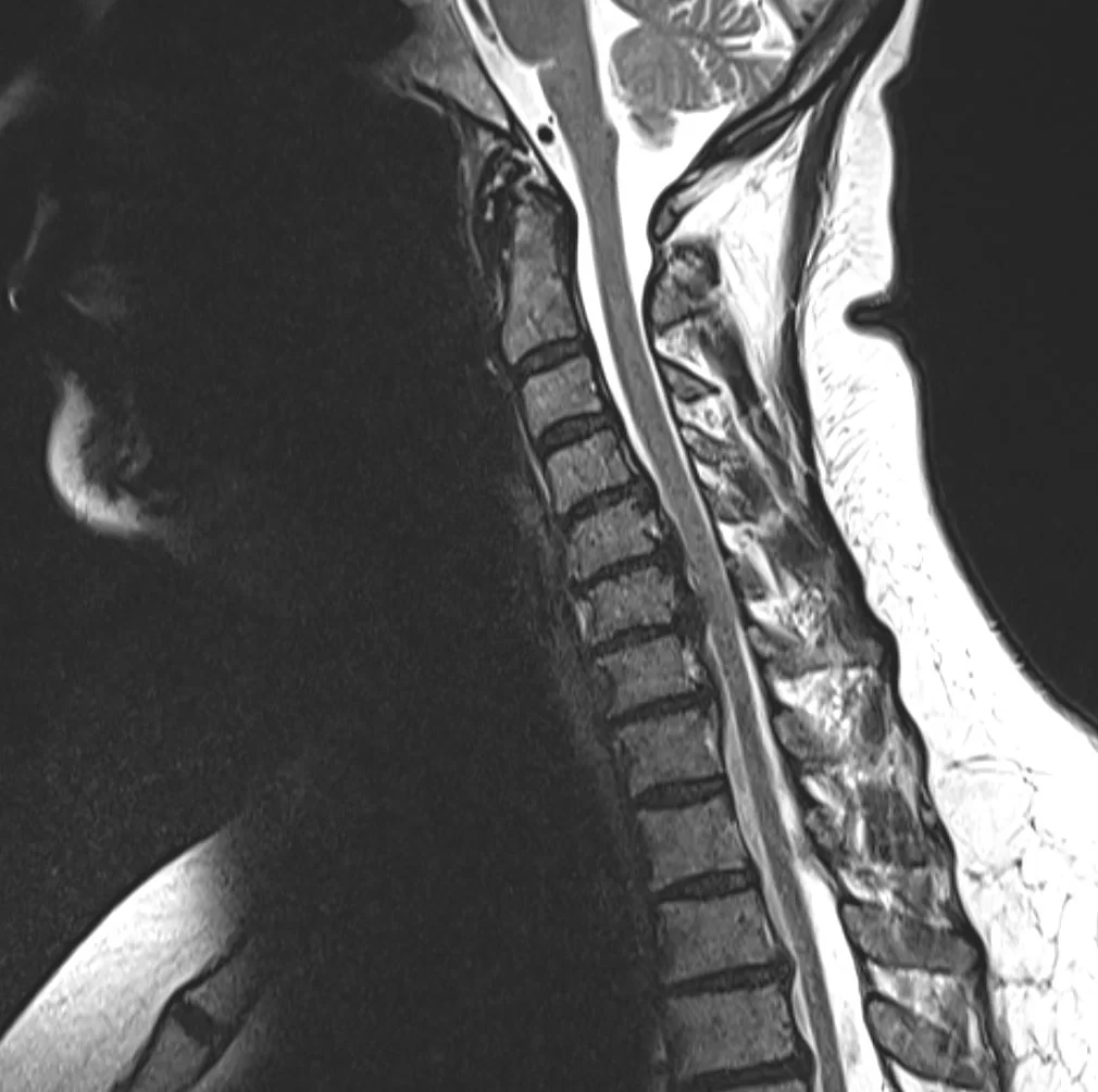 Ο απεικονιστικός έλεγχος έλεγχος με μαγνητική και αξονική τομογραφία της αυχενικής μοίρας της σπονδυλικής στήλης ανέδειξε σημαντική εκφύλιση της αυχενικής μοίρας της σπονδυλικής στήλης με πολυεπίπεδη στένωση λόγω εκτεταμένης οστεφύτωσης και επασβέστωσης του οπισθίου επιμήκους συνδέσμου.