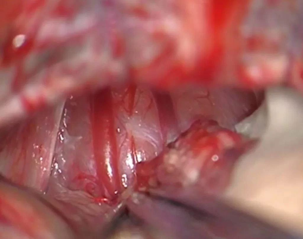 Διενεργήθη υποσκηνιδιακή υπερπαρεγκεφαλιδική προσπέλαση και ολική εξαίρεση της βλάβης.