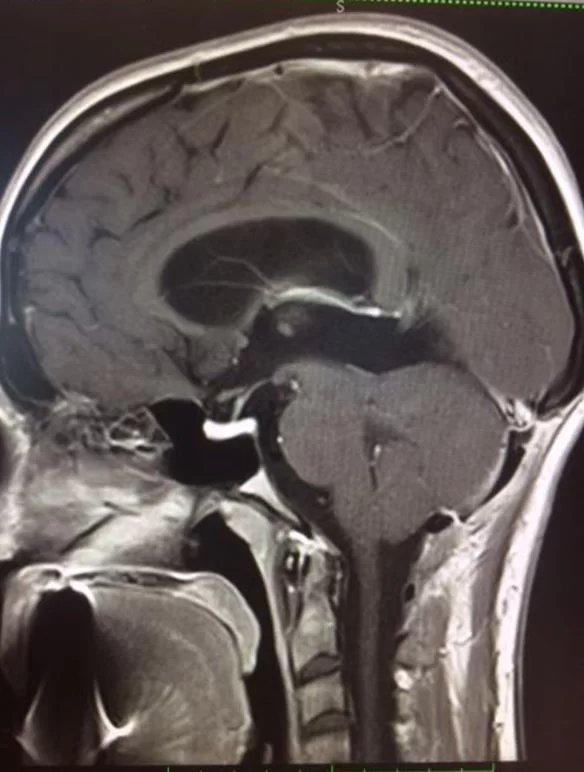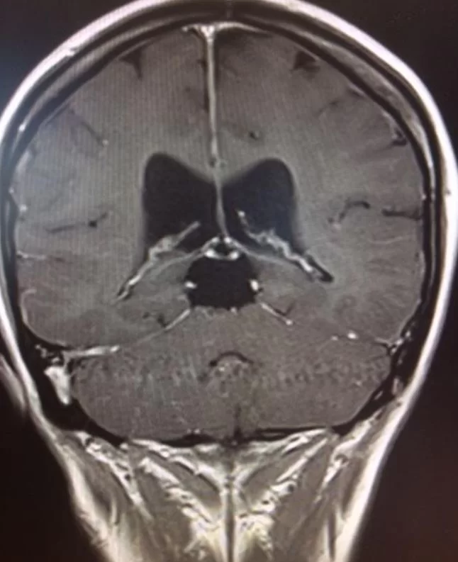 Ο απεικονιστικός έλεγχος με μαγνητική τομογραφία ανέδειξε ευμεγέθη όγκο στην περιοχή της επίφυσης (κωνάριο), καθώς επίσης και διάταση του κοιλιακού συστήματος (υδροκέφαλο)