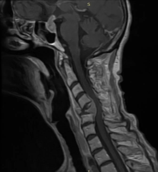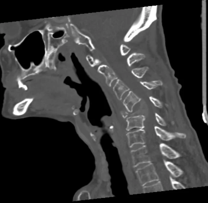 Ασθενής γυναίκα 61 ετών με σημαντική τετραπάρεση (αδυναμία άνω & κάτω άκρων) λόγω νεοδιαγνωσθείσας χωροκατακτητικής εξεργασίας (όγκος) στον Α5 σπόνδυλο, ο οποίος έχει διαβρώσει πλήρως το οστό και έχει προκαλέσει κάταγμα του σπονδύλου με αποτέλεσμα πίεση του νωτιαίου μυελού και σημαντική παραμόρφωση της σπονδυλικής στήλης.