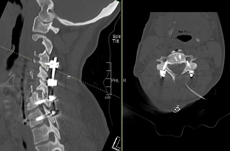 Πρόκειται για ένα δύσκολο περιστατικό, τόσο χειρουργικά όσο και στην επιλογή της κατάλληλης στρατηγικής. Είναι σαφές ότι η ασθενής χρειάζεται πλέον προσθιοπίσθια σπονδυλοδεσία για τη στήριξη του αυχένα της. Υπάρχουν όμως κάποια σημεία τα οποία χρήζουν ιδιαίτερης προσοχής: