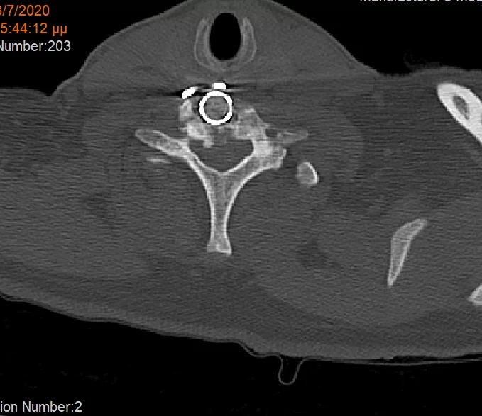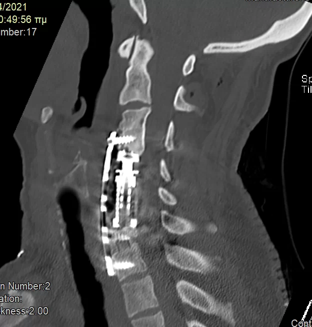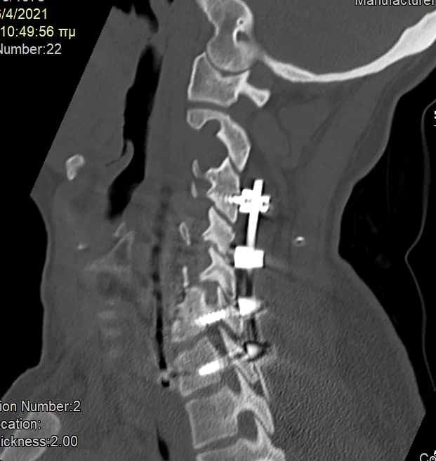 Ο απεικονιστικός έλεγχος με μαγνητική και αξονική τομογραφία της σπονδυλικής στήλης ανέδειξε εικόνα σωματεκτομής Α5, Α6 και μερικώς και Α7. Υπήρχε χαλάρωση των βιδών που καθήλωναν την πλάκα. Συνολικά εικόνα ψευδάρθρωσης και πίεσης επί του νωτιαίου μυελού και των αυχενικών ριζών (κυρίως Α7 δεξιά)