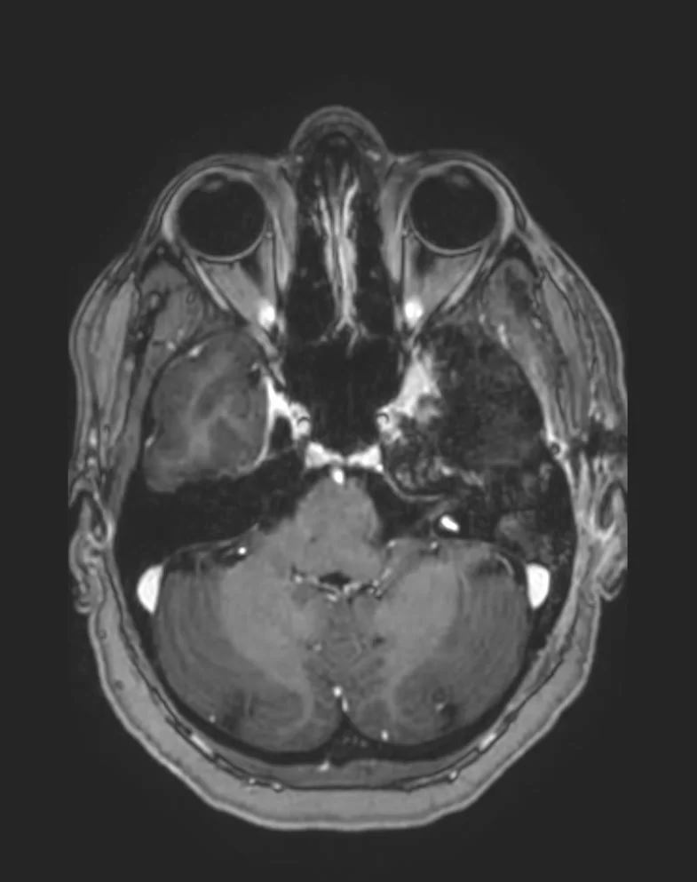 Η μαγνητική τομογραφία εγκεφάλου ανέδειξε χωροκατακτητική εξεργασία στην περιοχή του τριδύμου νεύρου αριστερά.