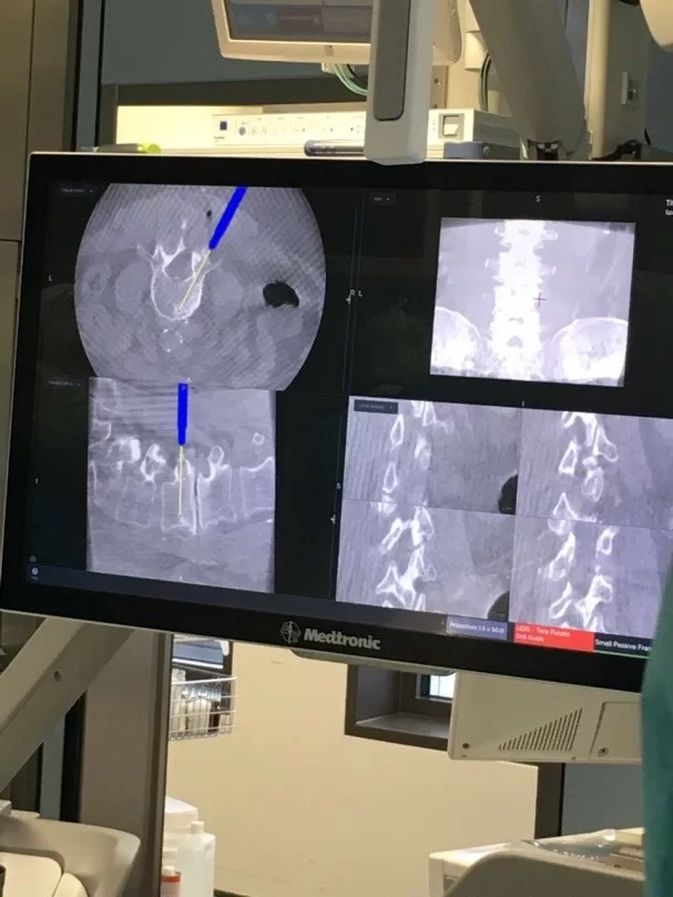 Σημαντική βοήθεια για τη διενέργεια τέτοιων επεμβάσεων αποτελεί η τρισδιάστατη νευροπλοήγηση της σπονδυλικής στήλης, η οποία επιτρέπει τα υλικά να τοποθετούνται με ακρίβεια χιλιοστού (Εικόνα 1 και 2).