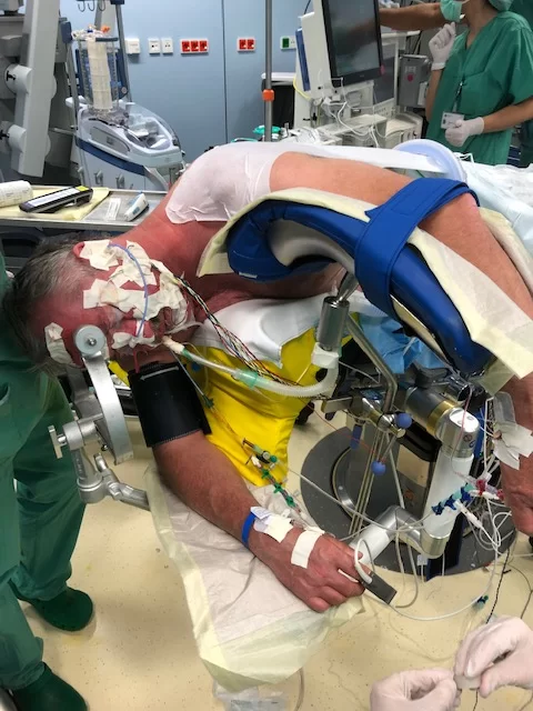 Εικόνα 1: Ασθενής τοποθετημένος σε θέση park-bench (3/4) λίγο πρίν την έναρξη της επέμβασης για αριστερό ακουστικό σβάννωμα. Προσέξτε τα ηλεκτρόδια για τη νευροπαρακολούθηση που είναι τοποθετημένα στο πρόσωπο και τα άκρα του ασθενούς (Προσωπικό αρχείο νευροχειρουργού Π. Σταυρινού).